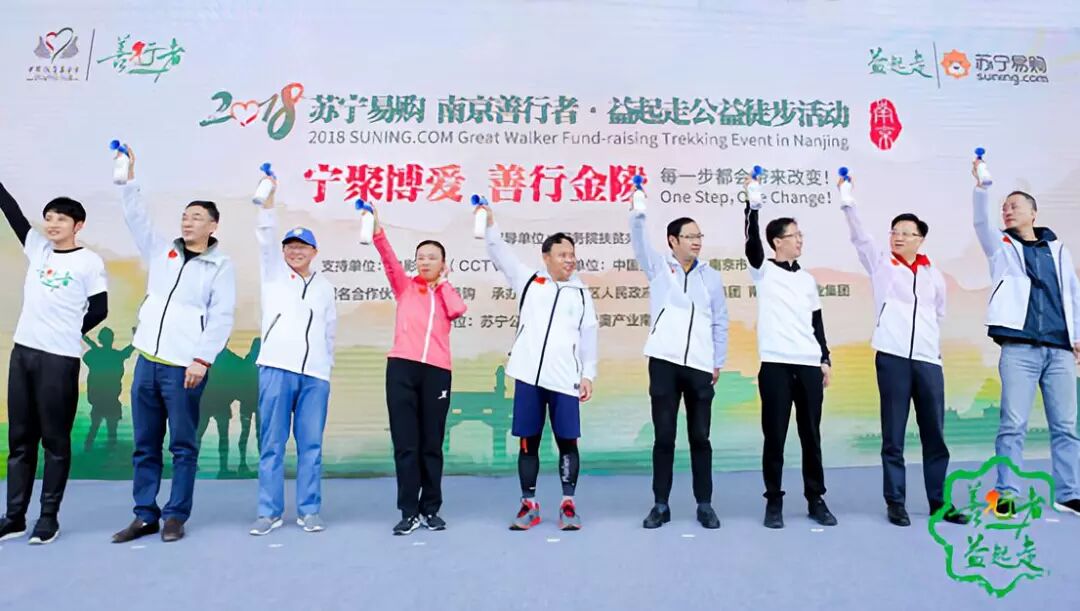 活动现场,中国扶贫基金会执行副会长王行最、南京市人民政府副秘书长吴秀亮、苏宁易购集团副董事长孙为民等共同为活动起跑鸣笛,并组队共同踏上50公里爱心之旅。