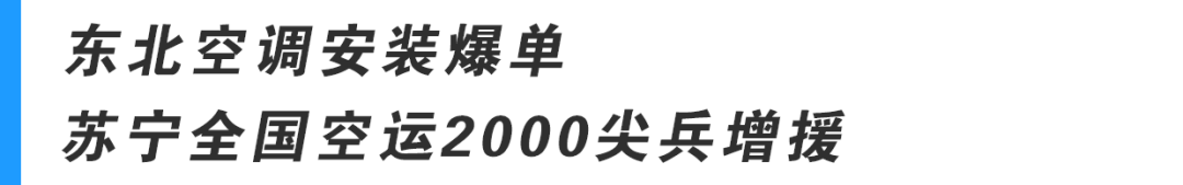 空调销售激增带来安装爆量。在监控到安装问题后,苏宁火速从北京、天津、宁波、徐州、青岛等地抽调近2000名服务工程师,直接“空运”至东北三省进行支援,保证空调安装及时上墙。