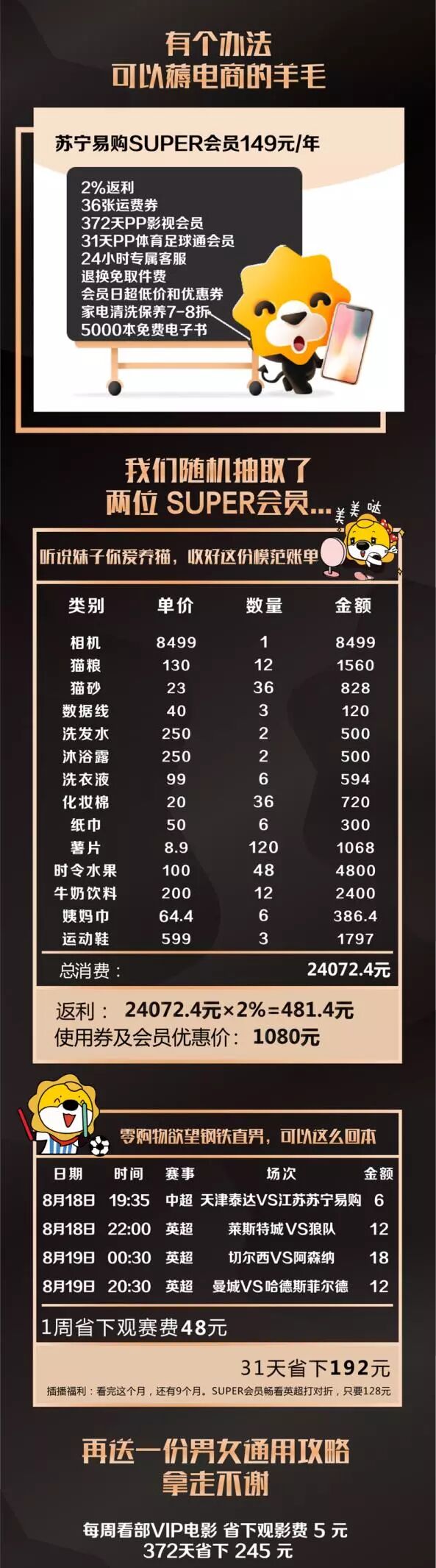 SUPER会员2%返利和每月会员日的超低价与优惠券,是最受消费者关注的权益之一。苏宁易购数据显示,SUPER会员人均通过会员日特惠能省下180元,在返利方面,苏宁易购拉出了一组女性猫奴的年度实际消费账单。这份总额为24072.4元的账单中,包括猫砂、猫粮、饮料、水果、洗护用品等日常消费,共获得481.4元返利和价值1080元的使用券及会员价优惠,到手的实惠10倍于会员费。