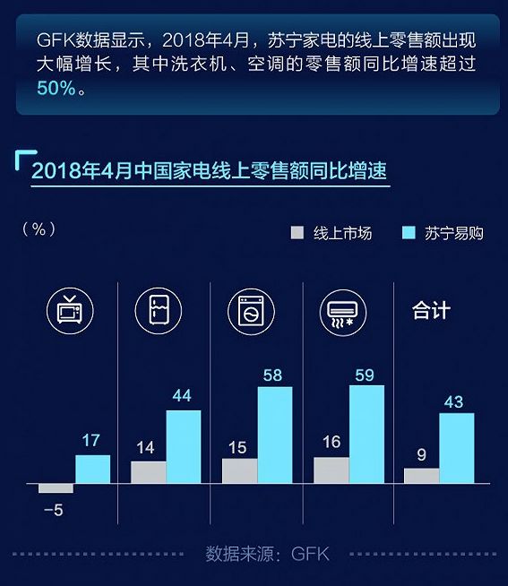 界面新闻整理各权威机构数据指出,2017年,苏宁易购GMV增速近60%,在电商平台增速整体放缓的情况下,远超京东、唯品会等综合电商平台。2018年一季度,苏宁家电线上各品类增长远超行业,其中洗衣机、空调等品类零售额同比增速超50%。