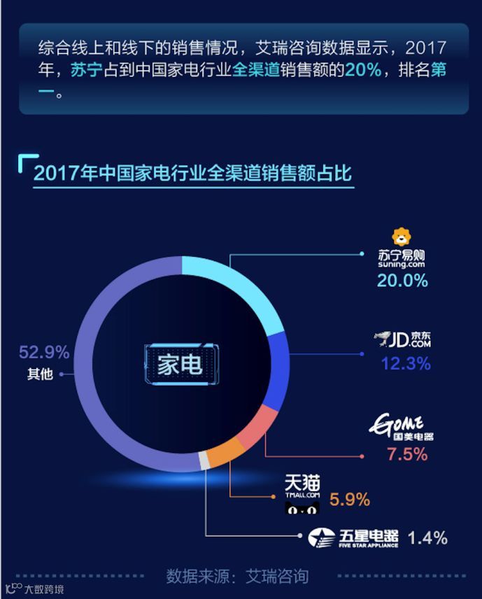618年中大促一触即发,家电市场作为电商大促的重磅阵地,一直吸引着最多的眼球关注。6月5日,界面新闻报道指出,苏宁雄踞家电市场全渠道销售王,市占率达20%。