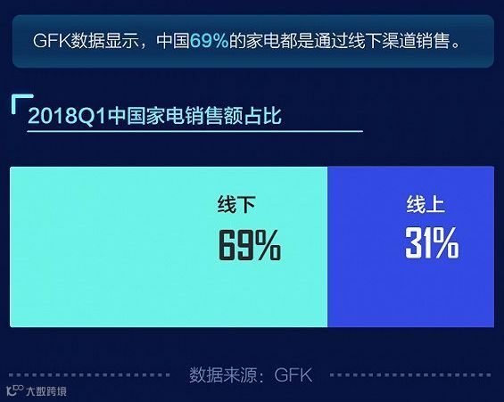 就家电市场而言,目前线下仍然为主战场,GfK数据显示,2018年Q1中国家电市场销售占比线下和线上分别为69%和31%,线下占据近7成的份额。