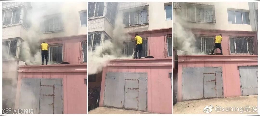 6月14日上午11点10分,苏宁帮客天津大区的两名服务工程师张帅、任常山在赶往下一个用户家,路过玉峰里小区时,忽然发现小区里的一栋楼的二层阳台上浓烟滚滚,两位师傅当即决定马上停车,下车后立刻冲到现场,此时火势已经蔓延,火苗足足有一米多高,浓烟不断产生,火灾现场围观的人越来越多,大家指指点点、一片哗然,却无人敢上前冒险救火。
