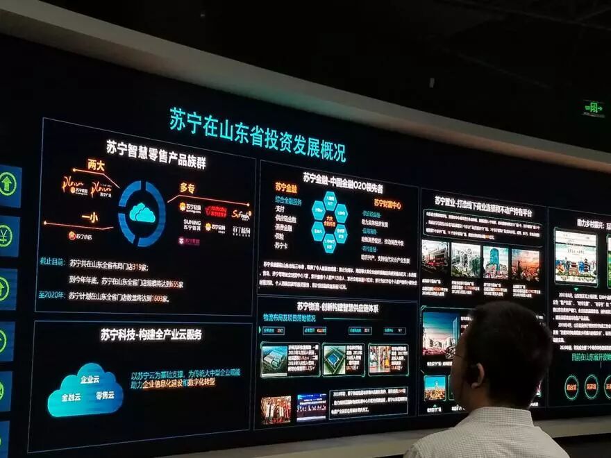 在苏宁展厅,代表团听取了苏宁智慧零售、科技创新、物流云以及在山东投资发展等情况介绍。