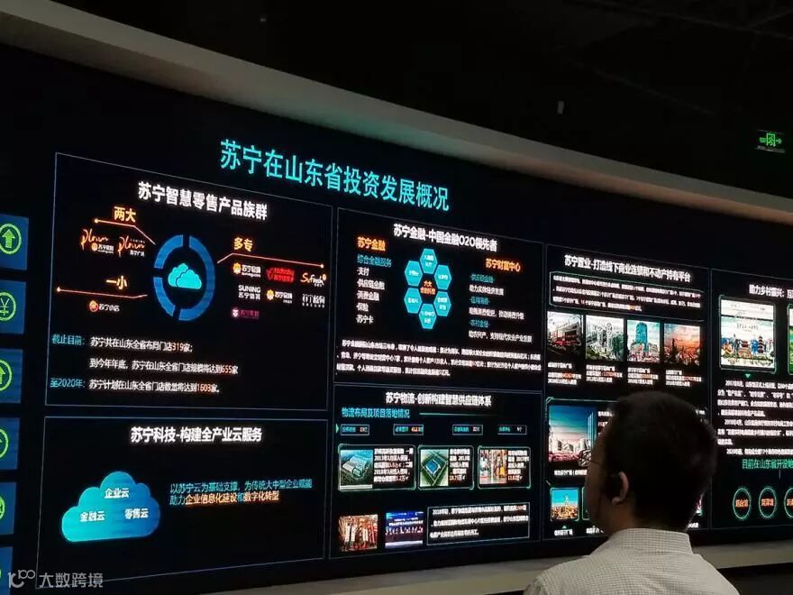 考察团一行参观了苏宁展厅,听取了苏宁智慧零售、科技创新、易购直播间、物流云以及苏宁在山东省投资发展等情况介绍。