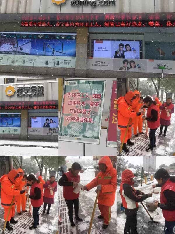 与此同时,苏宁分布各处的店面也积极参与送温暖活动。苏宁门店成为环卫工人、城管、交警、武警官兵、志愿者的临时歇脚处,并为其提供热水、姜茶。不仅如此,不少苏宁员工冒着严寒走向街头,为备战在风雪中的“勇士们”送去一杯暖暖的姜茶。