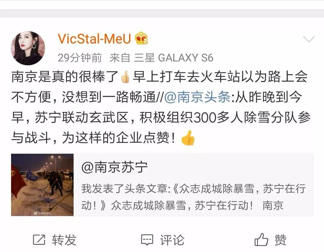 为应对本次强降雪工作,南京市委市政府多次召开专题部署会并一再强调,“要动员社会力量广泛参与,为城市畅通贡献力量。”苏宁作为扎根江苏的本土的企业,苏宁党员干部第一时间和扫雪办联系,从昨晚到今早,苏宁积极组织300多人除雪分队参与战斗,赶往人手缺乏的地方参与扫雪。