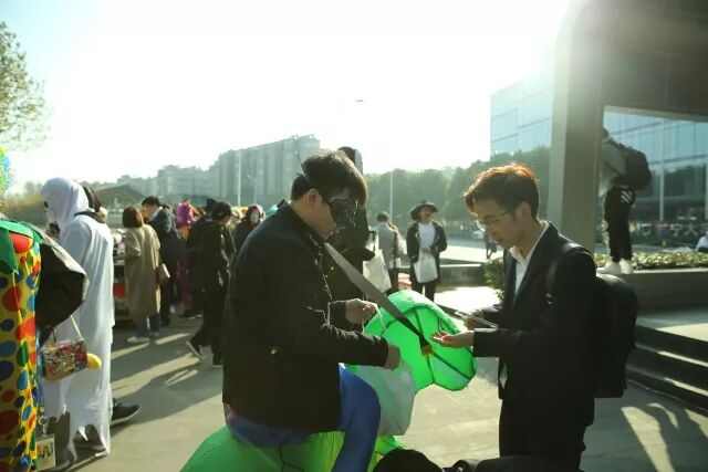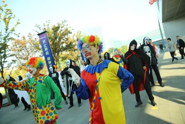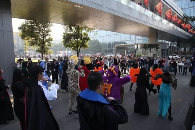 这帮“面目狰狞”的coser还玩了一把快闪,对于徐庄软件园的白领(我微笑中透露着贫穷)而言,万圣节快闪确实让我们的上班路不再单调啦。