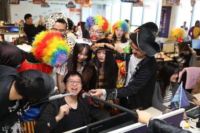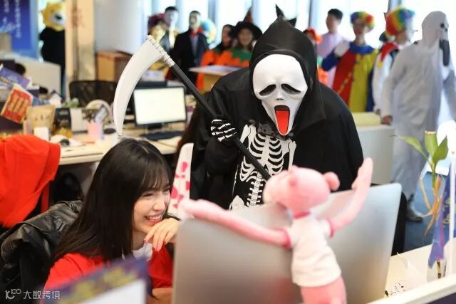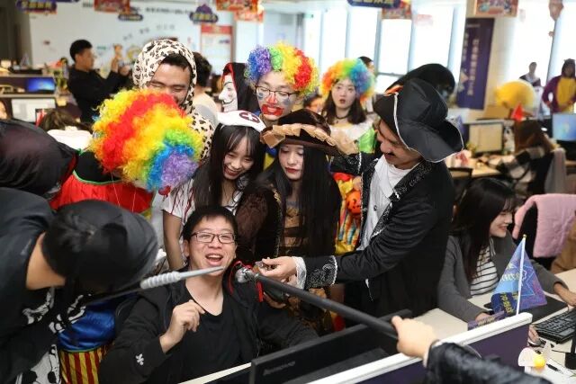 随后这群“鬼怪”coser开始集体蹲守公司园区的入口,一边捉弄胆儿小的员工,一边发糖果。这是源自西方万圣节“Trick or treat”的习俗,小孩子向大人索要糖果和礼物,否则就要调皮捣蛋。