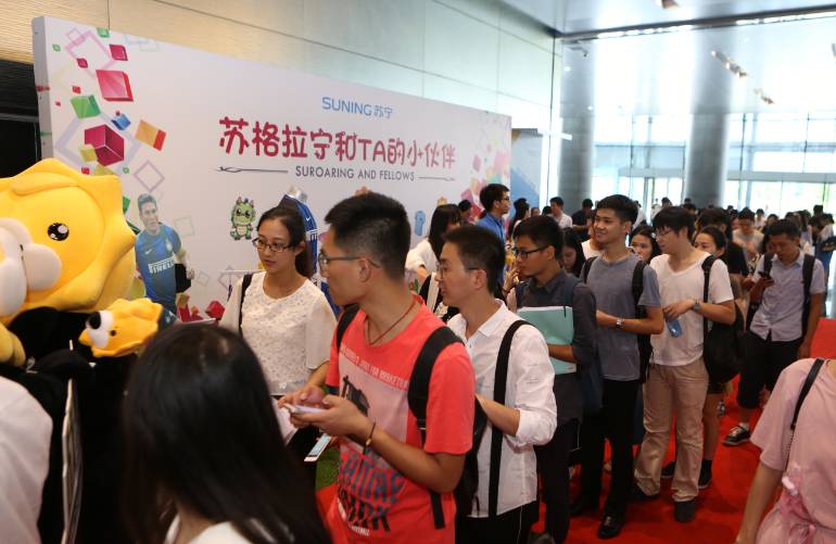 对于今年校招规模的扩大,孟祥胜说,这是为了满足苏宁六大产业协同多元化的快速发展的需求。今年进入世界500强之列的,就是苏宁旗下的产业之一苏宁云商。上半年苏宁云商销售规模上千亿元,归母净利润同比增长340%;前不久的818发烧节期间,苏宁实现线上销售增长263%,线下销售增长107%,可以说苏宁在规模化盈利之路上稳步前行,所以对优秀人才的需求也与日俱增。