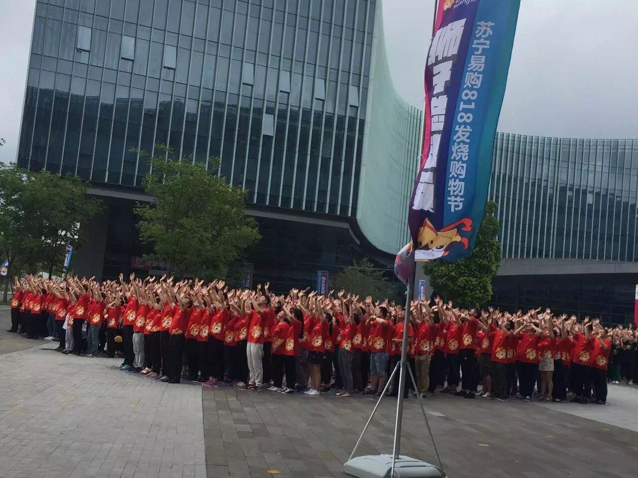 集团总部现场2022名苏宁人在二期易购楼广场穿着带有苏宁LOGO的红、黑、黄、紫、蓝、白5种颜色的T恤排成“SUNING 818 WIN”的字样,2架无人机直升天空,大家共同挥动双手,一起高声呼喊,“苏宁!”喊声响彻云霄。
