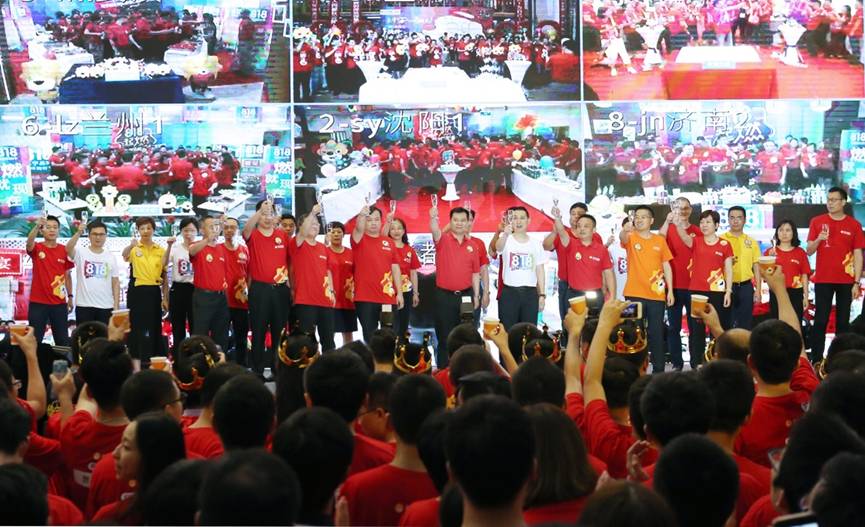(图:苏宁818庆功宴现场,高管与员工一同举杯庆祝。)