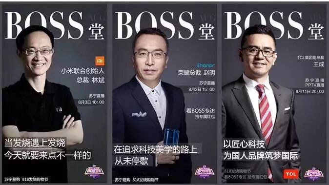 818期间,为了让品牌真正参与到818中来,市场团队从供应链、市场宣传、相互引流,用户互动等多个层面进行考量,推出BOSS堂。搭建专业的直播间,将各品牌的BOSS们从幕后邀请至台前,组成苏宁818的“超级朋友圈”,从8月2日至8月18日,数十位品牌大佬陆续做客818发烧购物节访谈节目《BOSS堂》,在PPTV开启直播做新品发布,将携超过1000款的爆款新品相继上线苏宁818,助力苏宁打造覆盖品类最全的购物节。承接声量的同时,也整合了品牌的资源,进行单天的品牌销量提升。BOSS堂期间的主推品牌GMV环比日销平均至少600%的增幅。
