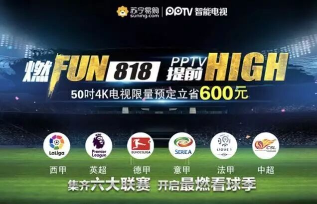 在苏宁正在开展的818大促中,体育传媒在广告植入等很多方面已经参与进来。记者注意到,在国内市场进入竞争“红海”的电视机销售领域,正是苏宁体育IP的加入产生了巨大的引流“魔力”:除了自己旗下的PPTV,苏宁还宣布将向三星、康佳、夏普、飞利浦、TCL、创维、海信、小米等植入苏宁PPOS系统的一线彩电品牌开放五大联赛赛事资源,打造专属体育频道,球迷无论用哪个品牌的电视,都可以观看到欧洲五大联赛精彩赛事。在此次818发烧节期间,苏宁也是祭出PPOS家族最大优惠,受到球迷“剁手党”的热捧。