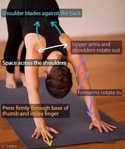 如果下犬式做的对,可以打开肩膀、加强手腕、展开上背部。为了正位,要学会手臂的内旋和外旋。