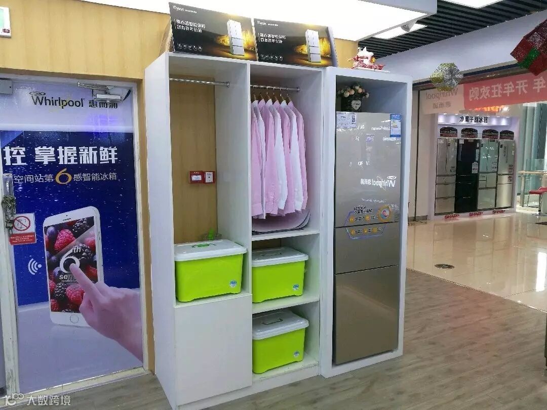 升级版的苏宁易购云店把单纯的消费购物变革为场景化的体验购物,空调专区部分品牌的展厅甚至被设置成了咖啡厅,消费者可以边喝咖啡边挑选商品。在惠而浦的冰箱专区里,一款三门惠而浦的冰箱被装进衣橱引起了记者的注意。这款冰箱主打超静音功能,在衣橱里也十分安静。