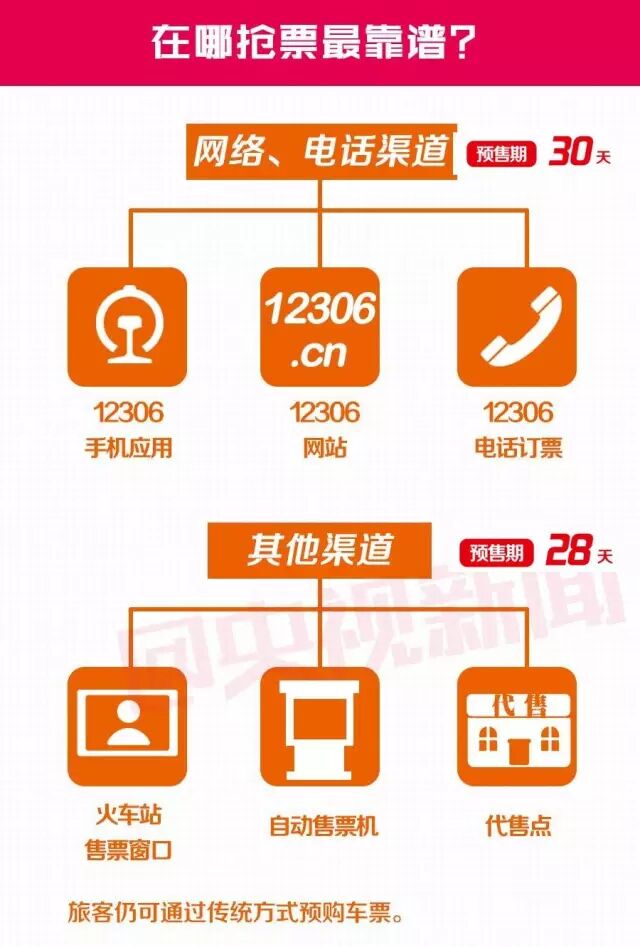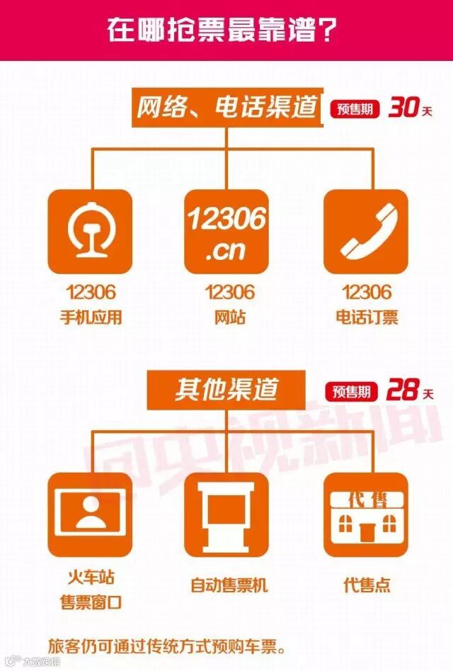 “目前,互联网(12306官网、12306手机APP)、电话(95105105、96006)等线上渠道预售期为30天,车站窗口、自动售票机和代售点等线下渠道为28天。”