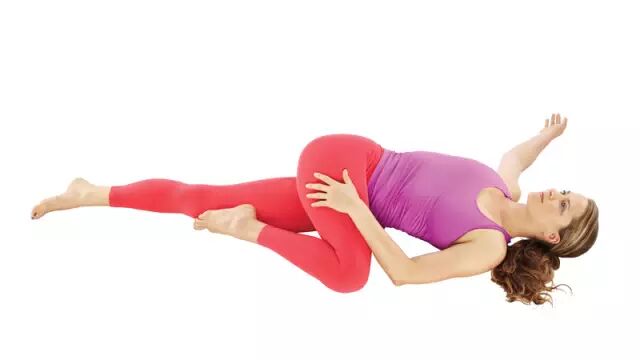 仰面躺在床上,膝盖弯曲,双脚平放在床上,双臂放在身体两侧伸开。慢慢的把你的膝盖放向你的左侧,同时眼睛看向你的右侧,尽量让自己感觉舒服,让你的肩膀贴在床上,上半部身体放松,保持这个动作5到10秒钟,然后慢慢的回到初始位置。换右侧重新做,每侧身体做3次。