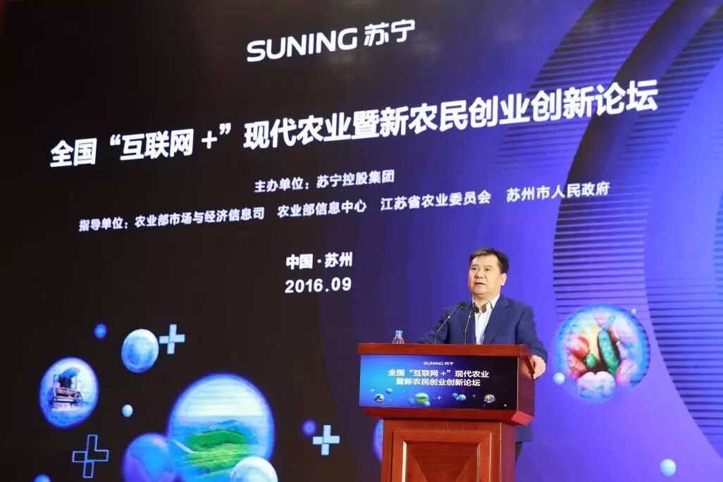 9月6日,由农业部、江苏省农委和苏州市政府指导,苏宁主办的“‘互联网+’现代农业暨新农民创业创新论坛”在苏州举行,农业部副部长屈冬玉、中央网信办副主任庄荣文、工业和信息化部原副部长杨学山、苏州市市长曲福田、苏宁控股集团董事长张近东、新希望集团董事长刘永好以及五名新农人在论坛上发表演讲。