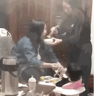 年轻的妈妈一口一口的喂着自己的女儿,而她的妈妈就站在她身边,一口一口喂着她。