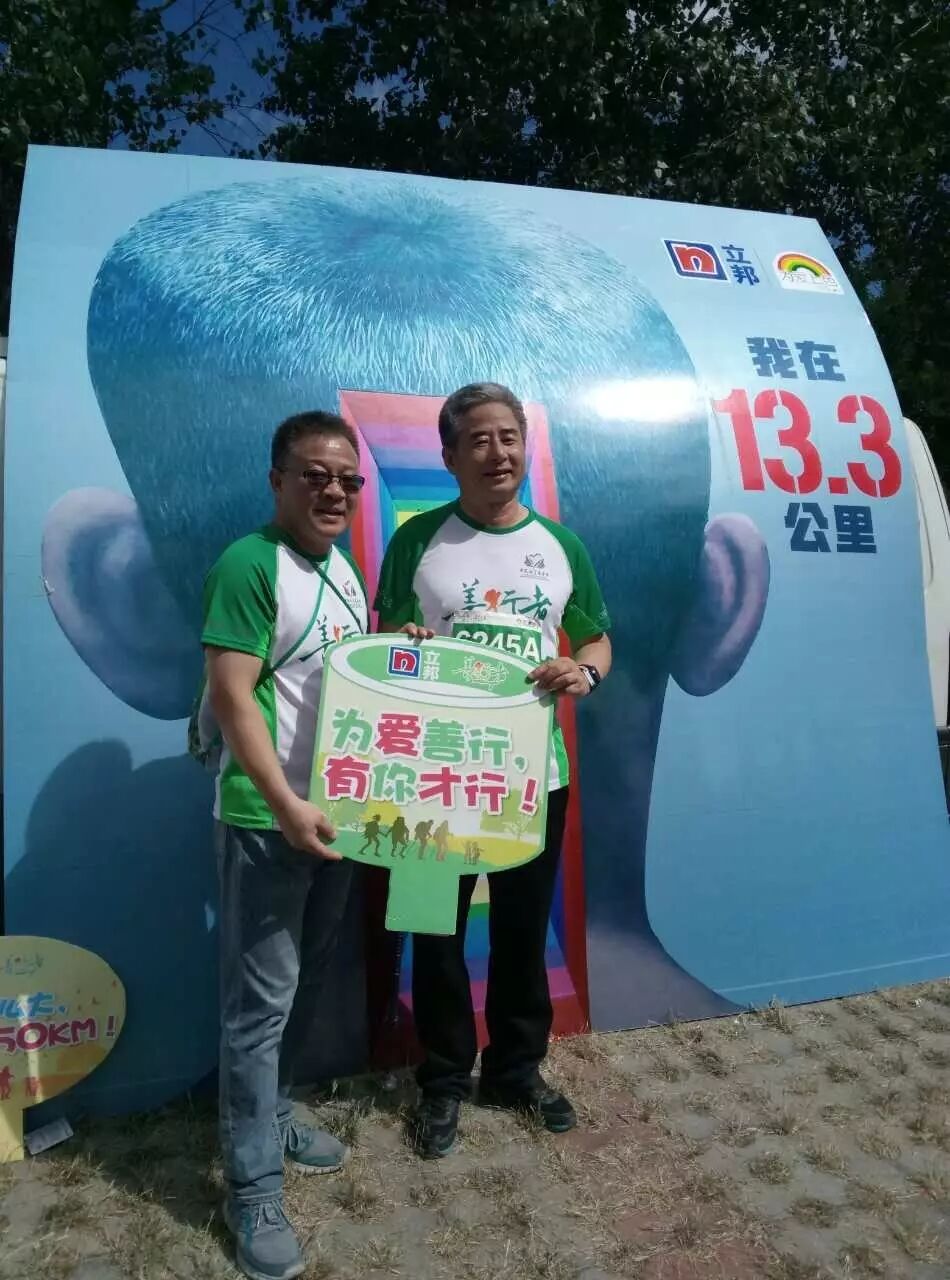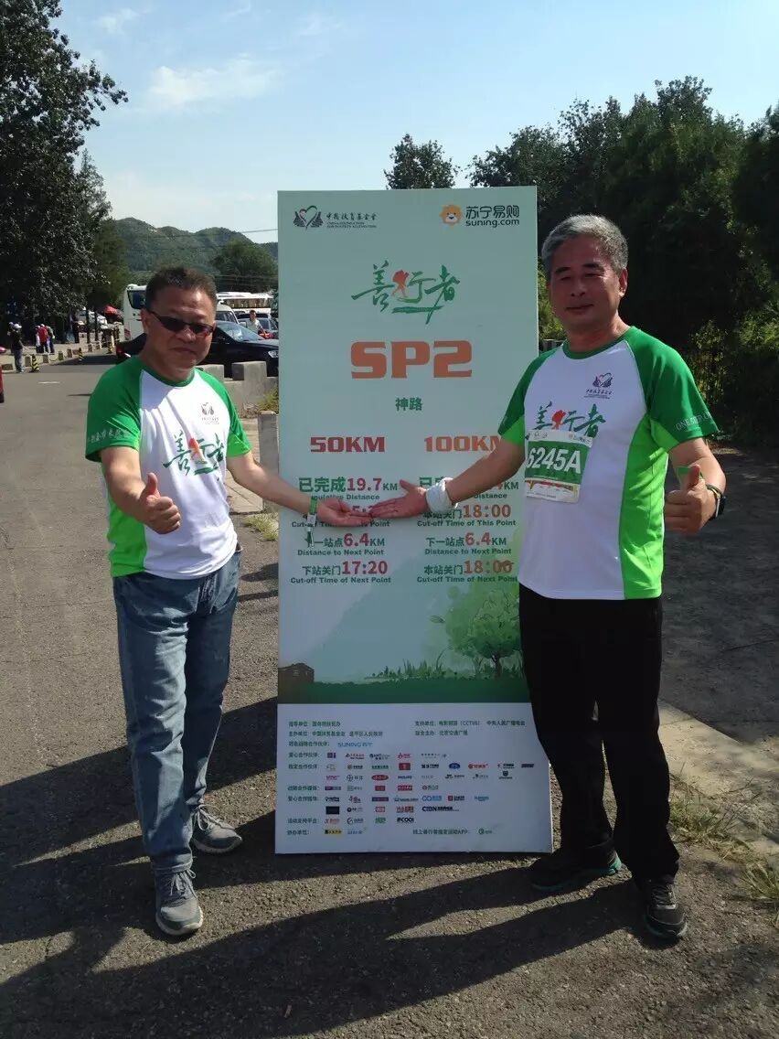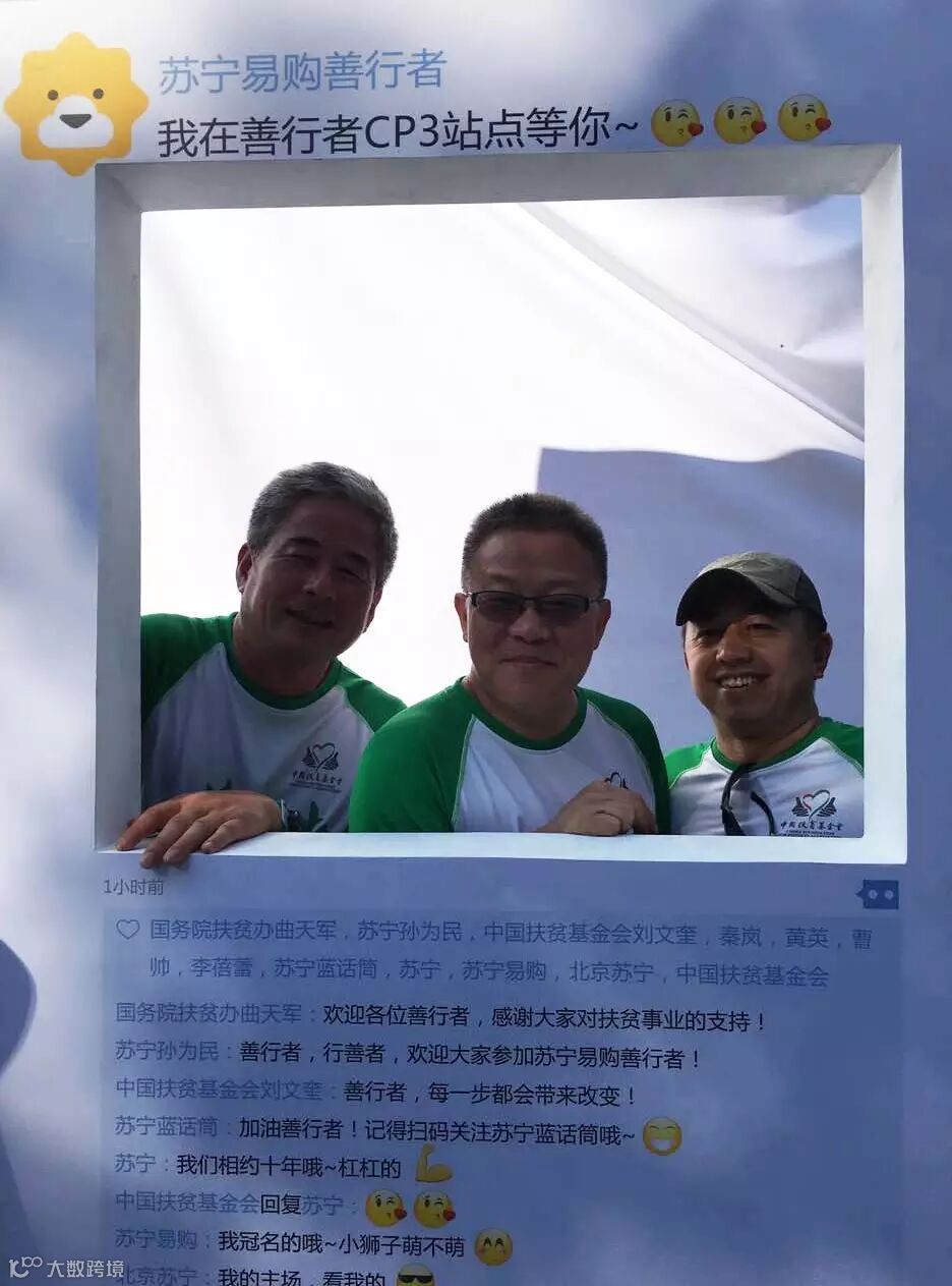经过一段时间的长途跋涉,上午10:30,国务院扶贫办国际合作与社会扶贫司巡视员曲天军、苏宁云商副董事长孙为民已经到达13KM打卡处,另外大批善行者也已经在这里进行打卡和补给。