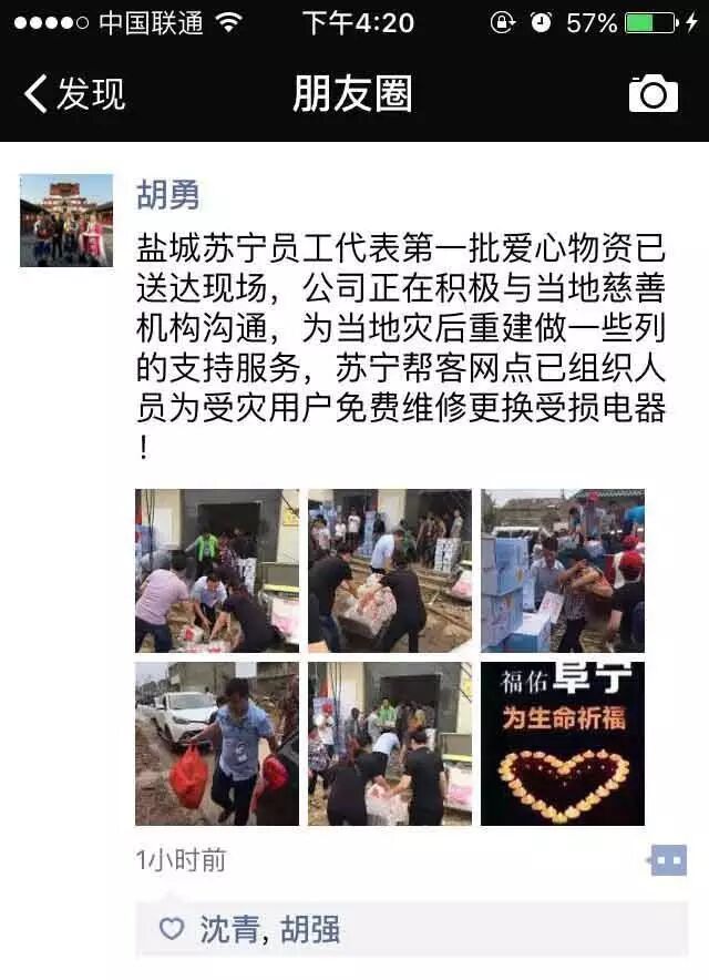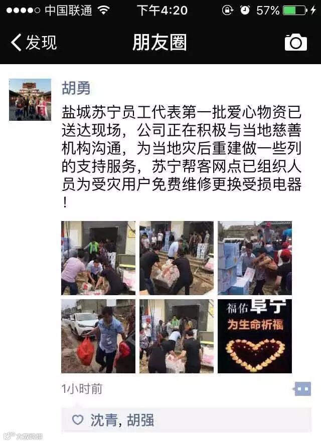 危难之时,尽显温情,尽己所能,做力所能及之事。灾难发生后,我们的苏宁盐城的小伙伴也立即投入到救灾当中,盐城苏宁阜宁区域内的苏宁门店、苏宁易购直营店、苏宁服务网点第一时间开通救灾便民服务站,为受灾人员、救护人员提供饮用水、食品、休息区、移动设备充电等服务。苏宁阜宁区域工作人员第一时间将首批当地急需救灾物资(饮用水、食品)送至救灾前线。