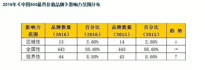 根据入选品牌影响力范围大小,按照区域性、全国性和世界性对品牌进行划分。本次榜单中具有全国范围影响力的品牌有443个,占88.60%;具有世界性影响力的品牌数为44个,这一数据比去年有所提高。