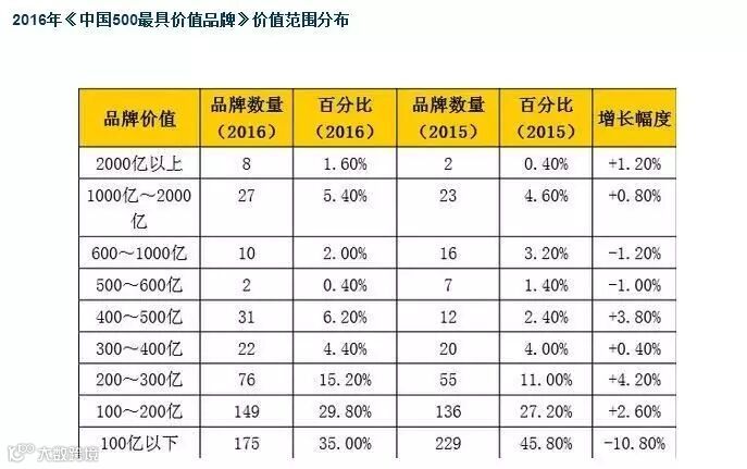 本年度共有35个中国品牌的价值超过1000亿,比去年增加了10个。其中品牌价值在2000亿以上的品牌有8个;品牌价值在1000亿至2000亿之间的有27个。