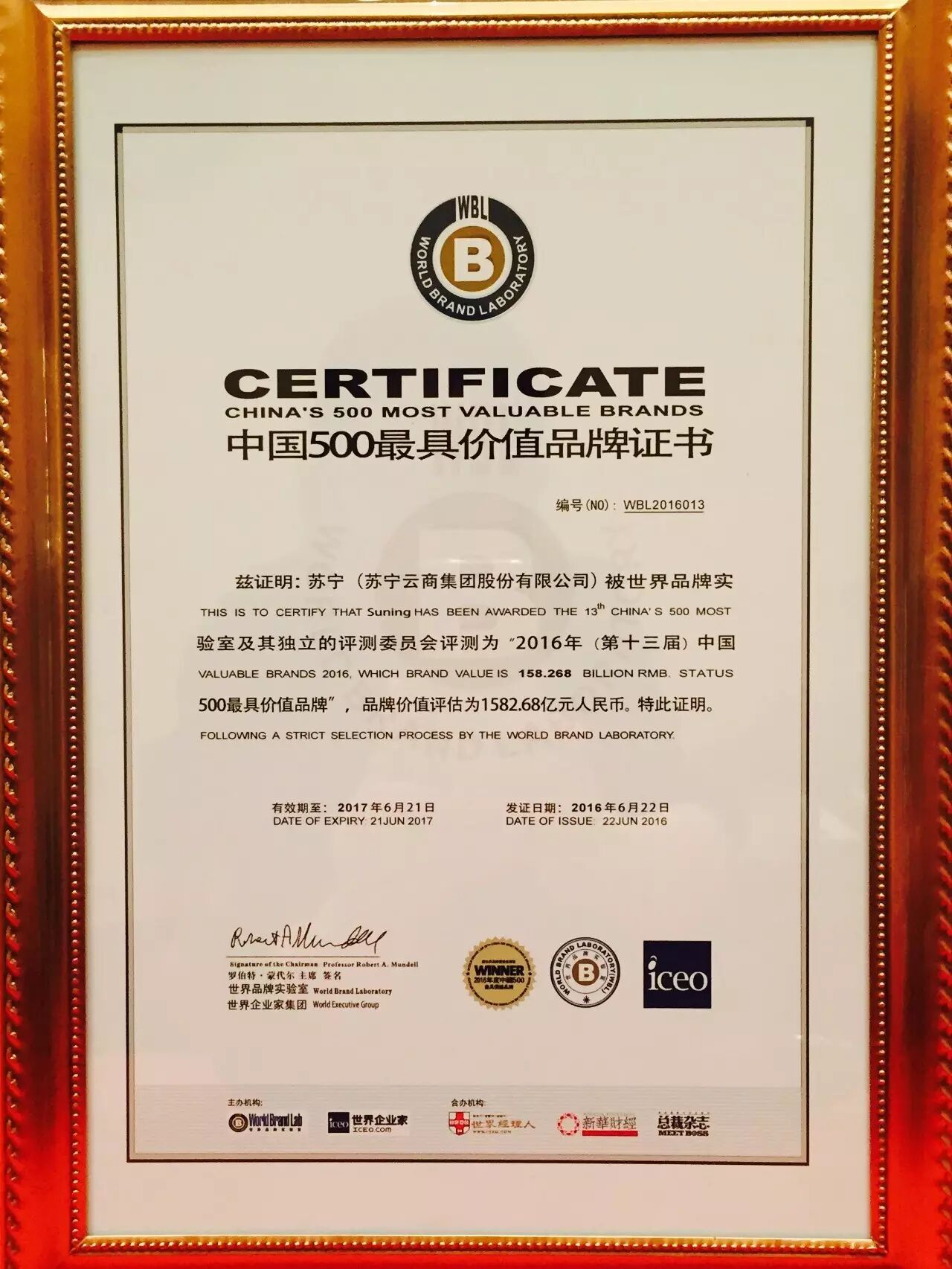 6月22日下午,世界品牌实验室(World Brand Lab)在北京发布了2016年《中国500最具价值品牌》榜单,苏宁以1582.68亿元的品牌价值位列品牌榜第13名,稳居零售业第一位。