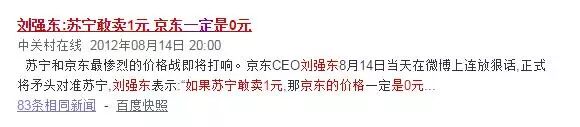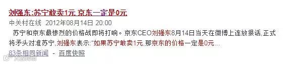 刘强东8月14日当天在微博上连放狠话,“今日京东商城所有大家电价格都将比苏宁便宜!并且无底线的便宜,如果苏宁敢卖1元,京东的价格一定是0元。”