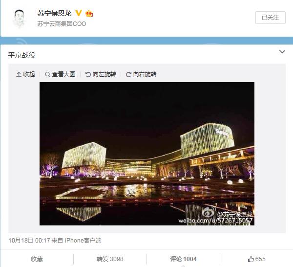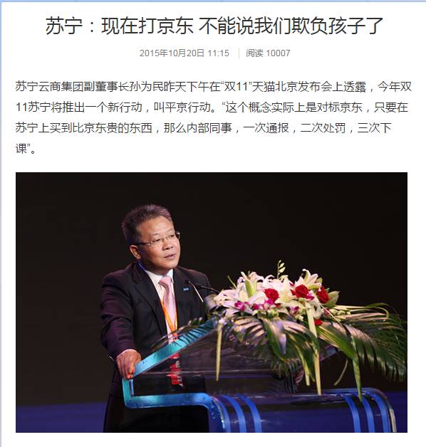 孙总在参加“双11”天猫北京发布会上表示,平京的意思就是对标京东,只要在苏宁上买到比京东贵的东西,那么内部同事,一次通报,二次处罚,三次下课。
