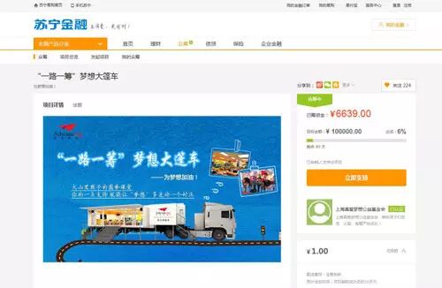 前两天大贝一心潜伏在物流体系,正当鄙人打算长期潜伏下去的时候,天空一声巨响,苏宁众筹闪亮登场!此番上线的众筹项目涵盖助学公益、智能设备开发、农产品直采、影视片制作、体育文创、消费金融等多个领域。
