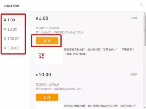 点击立即支持,就立马跳出1元、十元、一百元、五百元的支持页面。