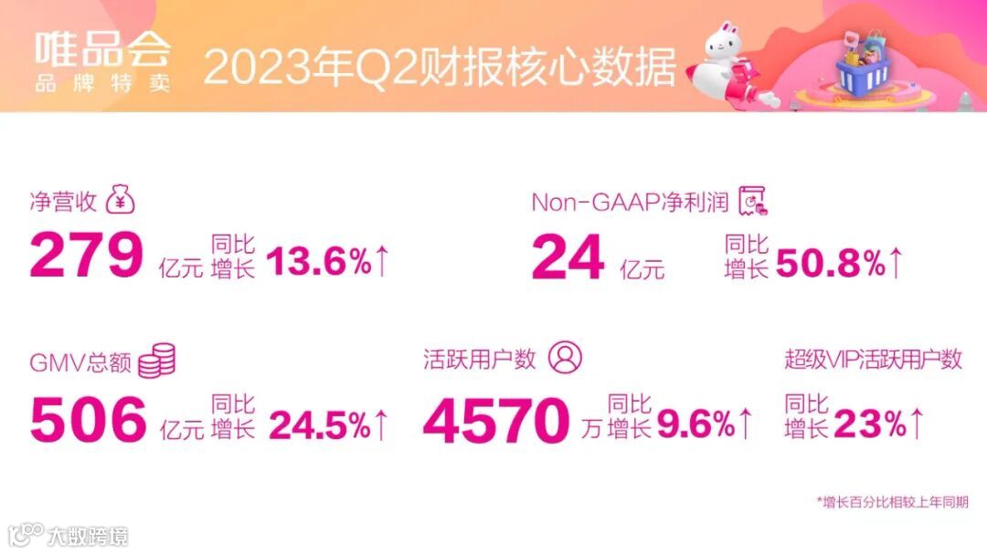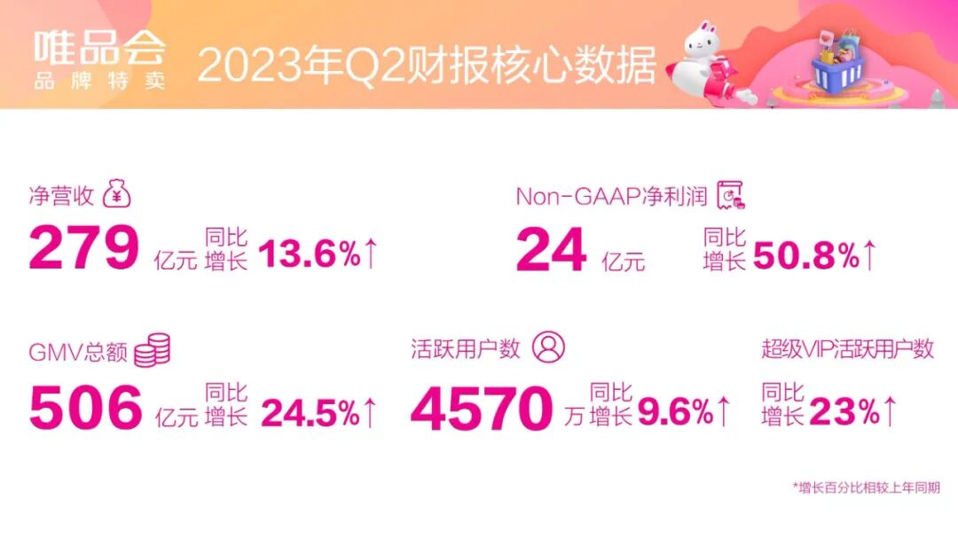 中国领先的在线品牌折扣零售商唯品会发布2023年第二季度财报。财报显示,唯品会第二季度实现净营收279亿元(人民币,下同),同比增长13.6%;Non-GAAP净利润24亿元,同比增长50.8%。同时,二季度GMV为506亿元,同比增长24.5%;活跃用户数达4570万,同比增长9.6%;订单数达2.138亿,同比增长14.7%。