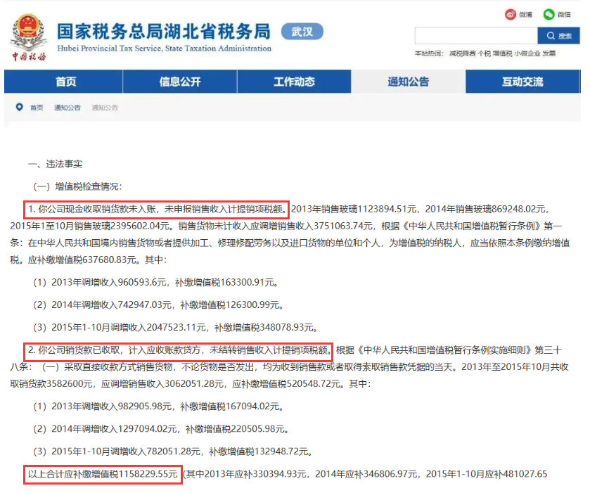 近日,武汉市税务局在稽查过程中发现武汉某公司存在:收取销货款未入账,未申报销售收入计提销项税额的情况,最终应补缴增值税1158229.55元!