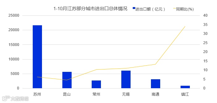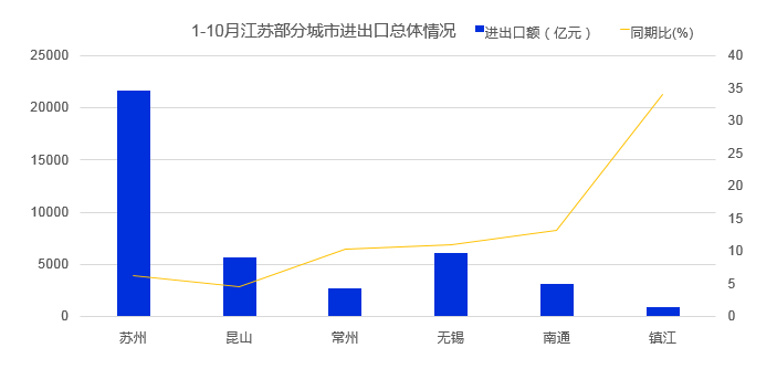 江苏:江苏省外贸进出口总值4.54万亿元,同比增长8.5%,占全国进出口总值13.1%。江苏部分城市中,苏州进出口总值最高,位列全国外贸规模领先城市第四位;镇江同比增速最快,达到34%,增速位居全省第一;南通、常州进出口总额分别位居全省第四、五位。