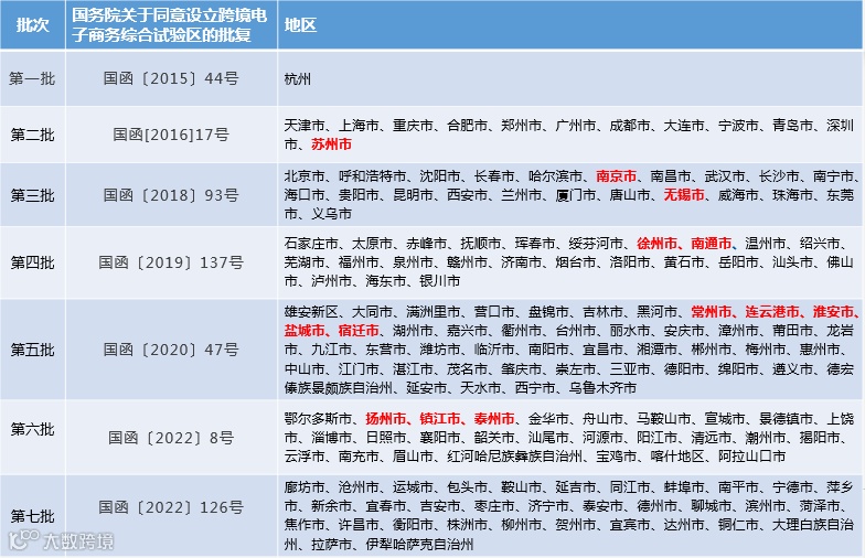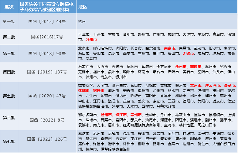11月24日,《国务院关于同意在廊坊等33个城市和地区设立跨境电子商务综合试验区的批复》正式发布,同意在廊坊市、枣庄市、拉萨市等33个城市和地区设立跨境电子商务综合试验区。至此,中国跨境电子商务综合试验区数量达到165个,覆盖31个省份,这是中国设立的第七批跨境电子商务综合试验区。