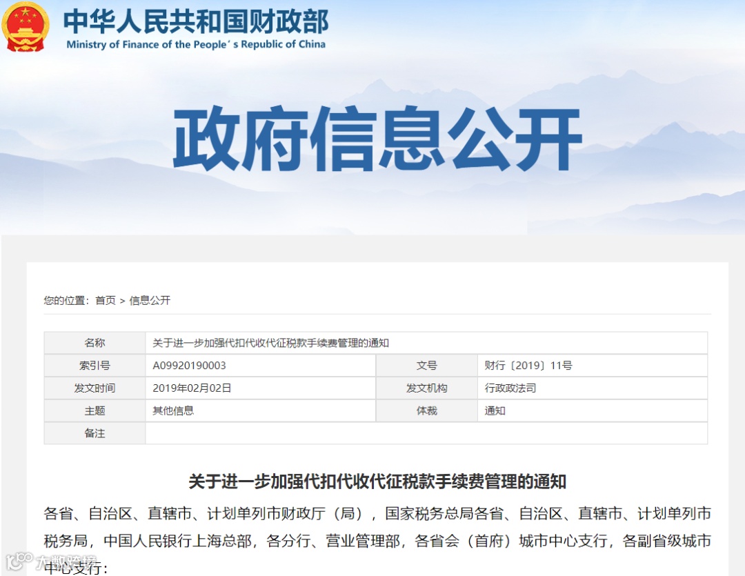 财行〔2019〕11号规定了个税代扣代缴手续费的返还比例和核算、使用要求。