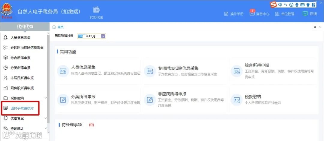 第二步:登录扣缴端后,在“代扣代缴”界面,点击左侧菜单“退付手续费核对”