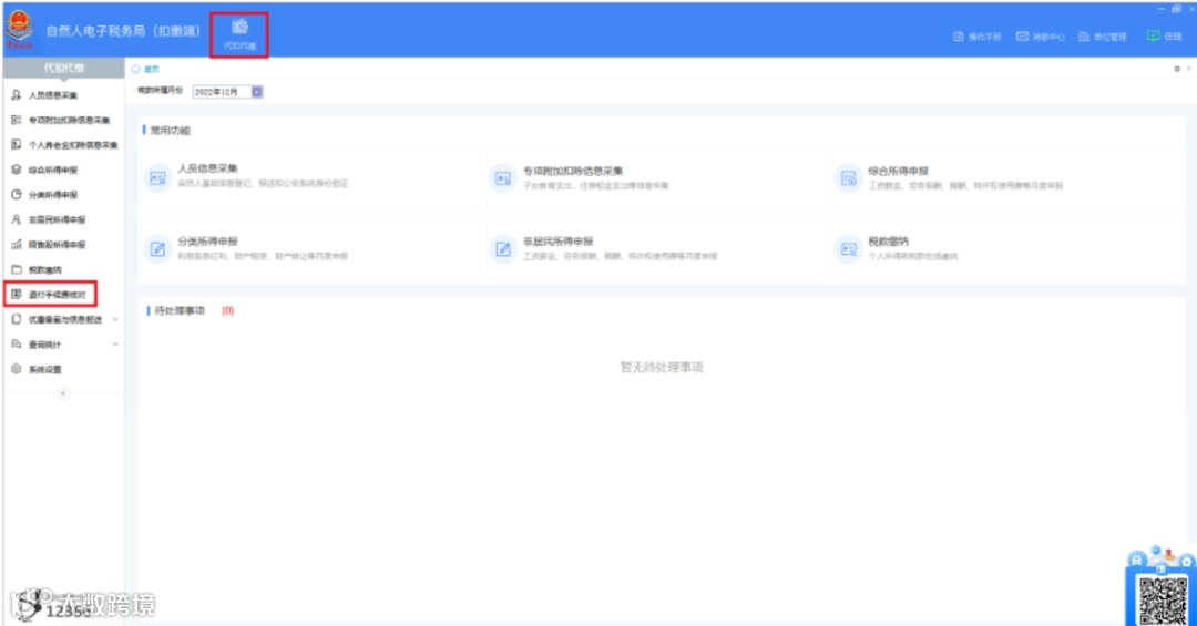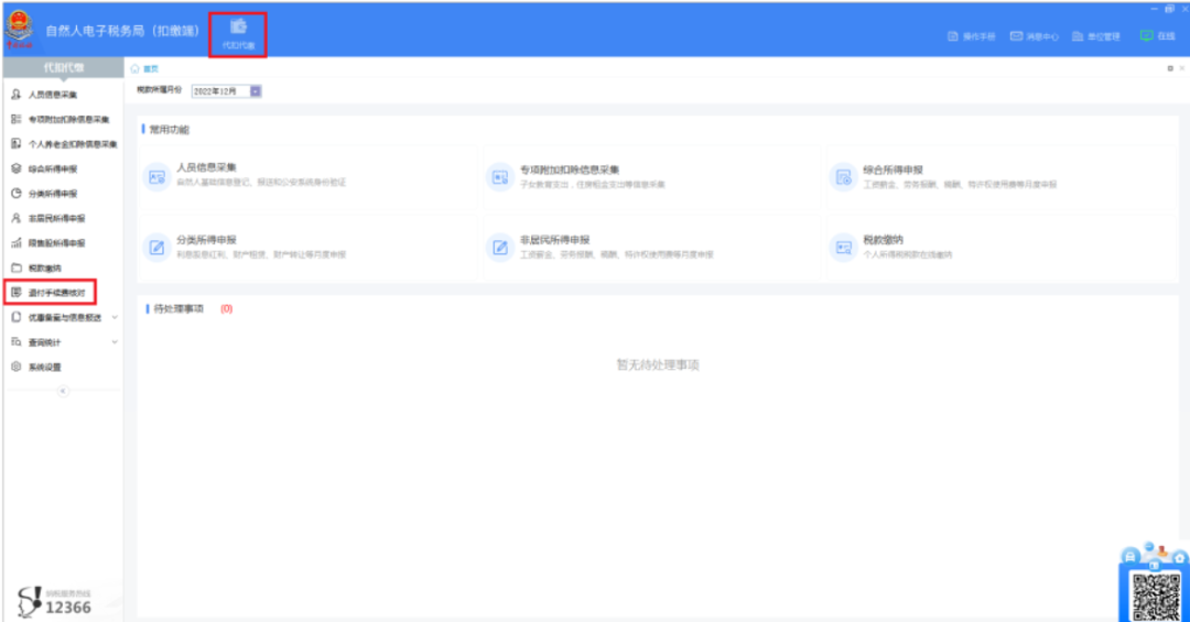 第二步:登录后,在“代扣代缴”界面,点击左侧菜单栏内的“退付手续费核对”。