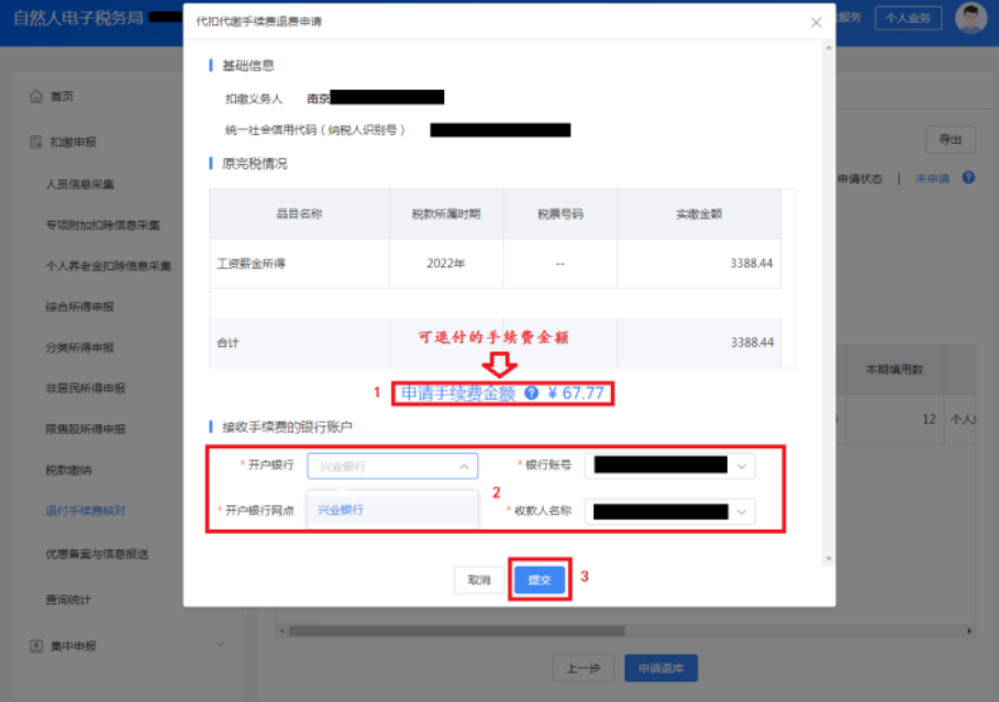 第七步:系统弹出“代扣代缴手续费退费申请”,查看申请手续费金额,选择“开户银行”、“银行账号”,点击【提交】。提示信息“确认成功”弹窗,点击【确定】。完成后系统将推送至税务机关及国库审核,审核通过后,申请的手续费将退到扣缴义务人办理退付手续费时选择的银行账户内。