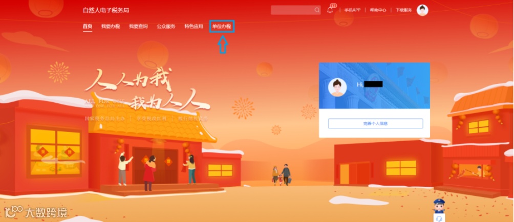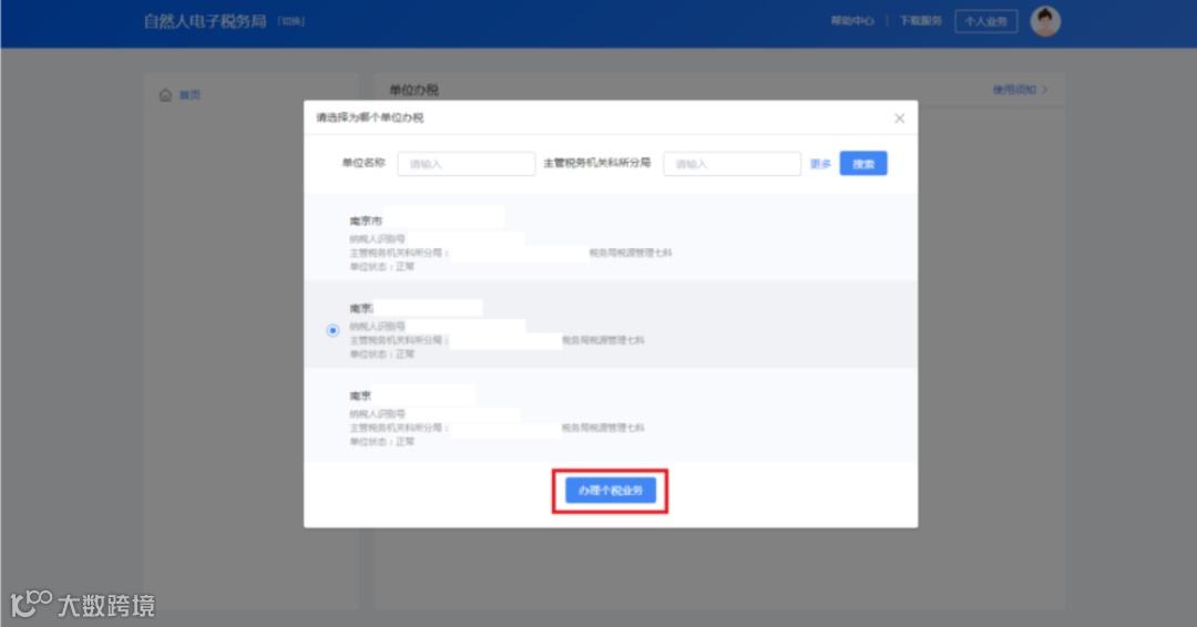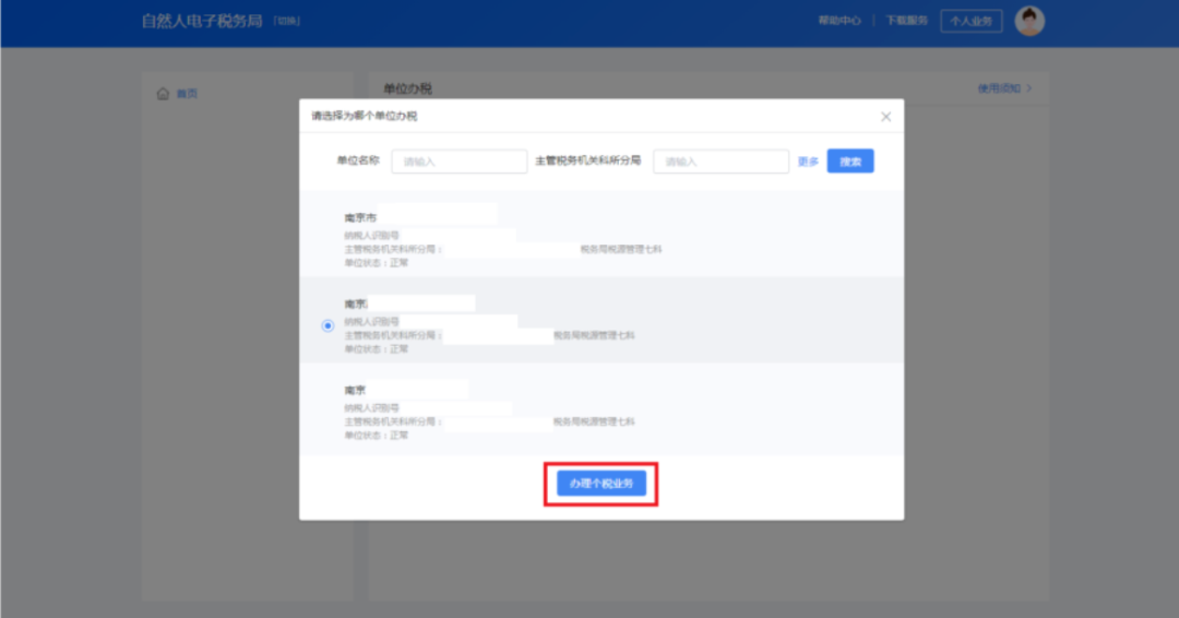 第三步:点击【单位办税】后选择对应企业,点击【办理个税业务】。