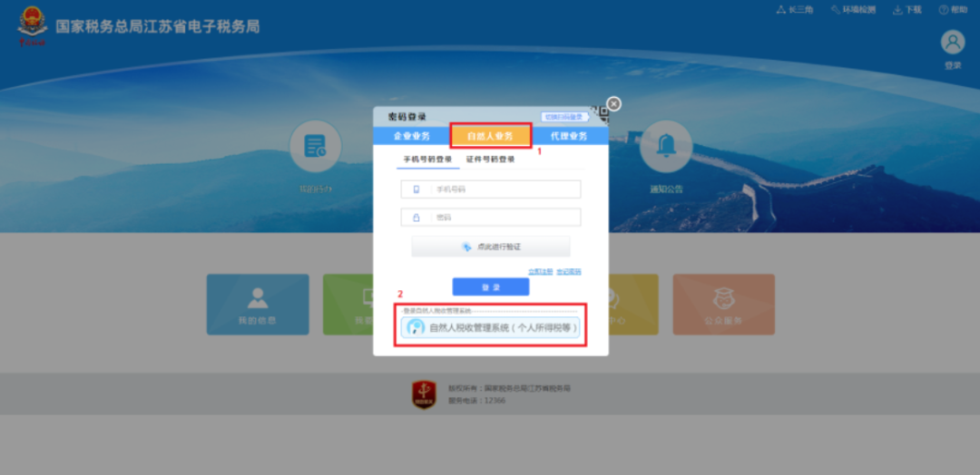 第一步:进入国家税务总局江苏省电子税务局网站,在“自然人业务”登录界面点击“自然人税收管理系统(个人所得税等)”。