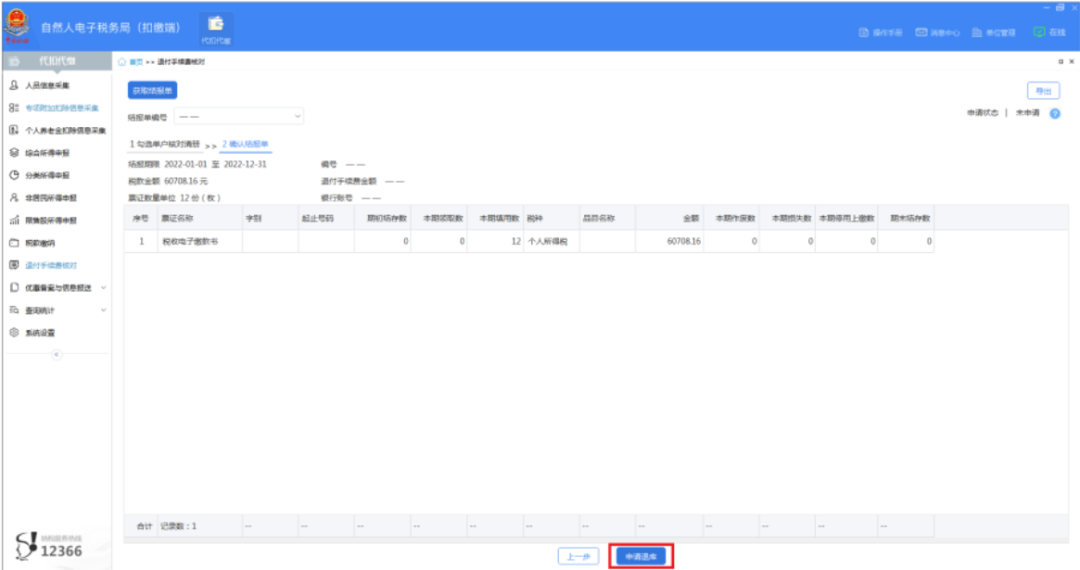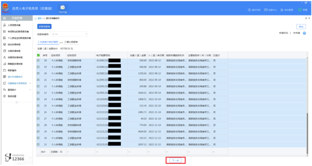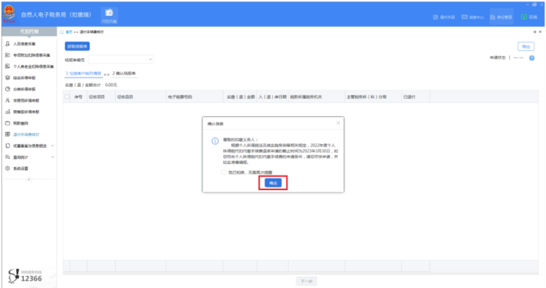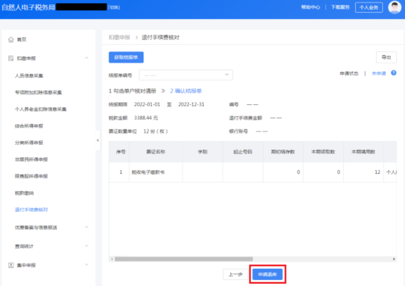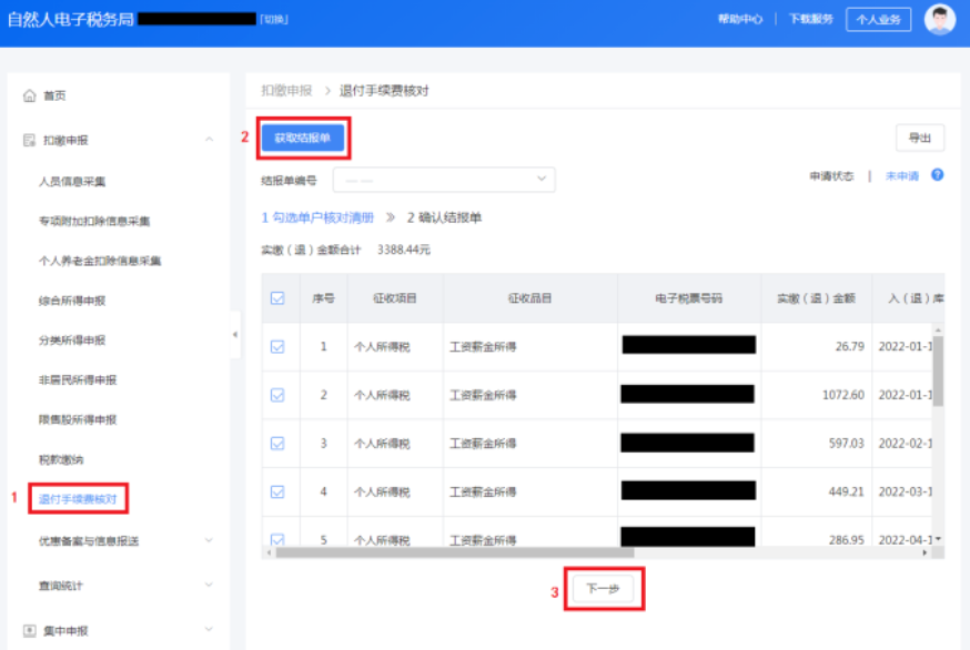 第五步:在左侧【扣缴申报】模块下,点击【退付手续费核对】,再点击【获取结报单】,核对单位2022年度扣缴税款信息,核对无误后,点击【下一步】。