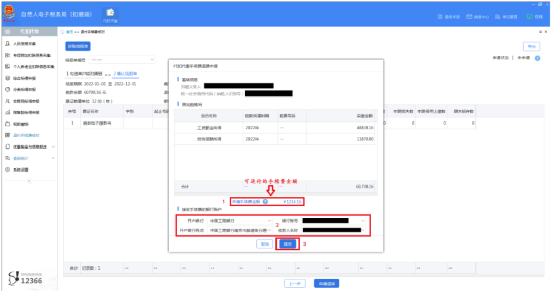 第六步:系统弹出“代扣代缴手续费退费申请”,查看申请手续费金额,选择“开户银行”、“银行账号”,点击【提交】。提示信息“确认成功”弹窗,点击【确定】。完成后系统将推送至税务机关及国库审核,审核通过后,申请的手续费将退到扣缴义务人办理退付手续费时选择的银行账户内。