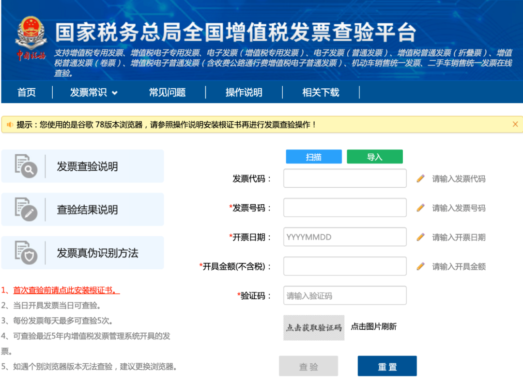 2)全电发票查验途径单位和个人可以通过全国增值税发票查验平台查验全电发票信息。(https://inv-veri.chinatax.gov.cn)可以手动输入发票代码及发票号码等基本信息,也可以直接导入。