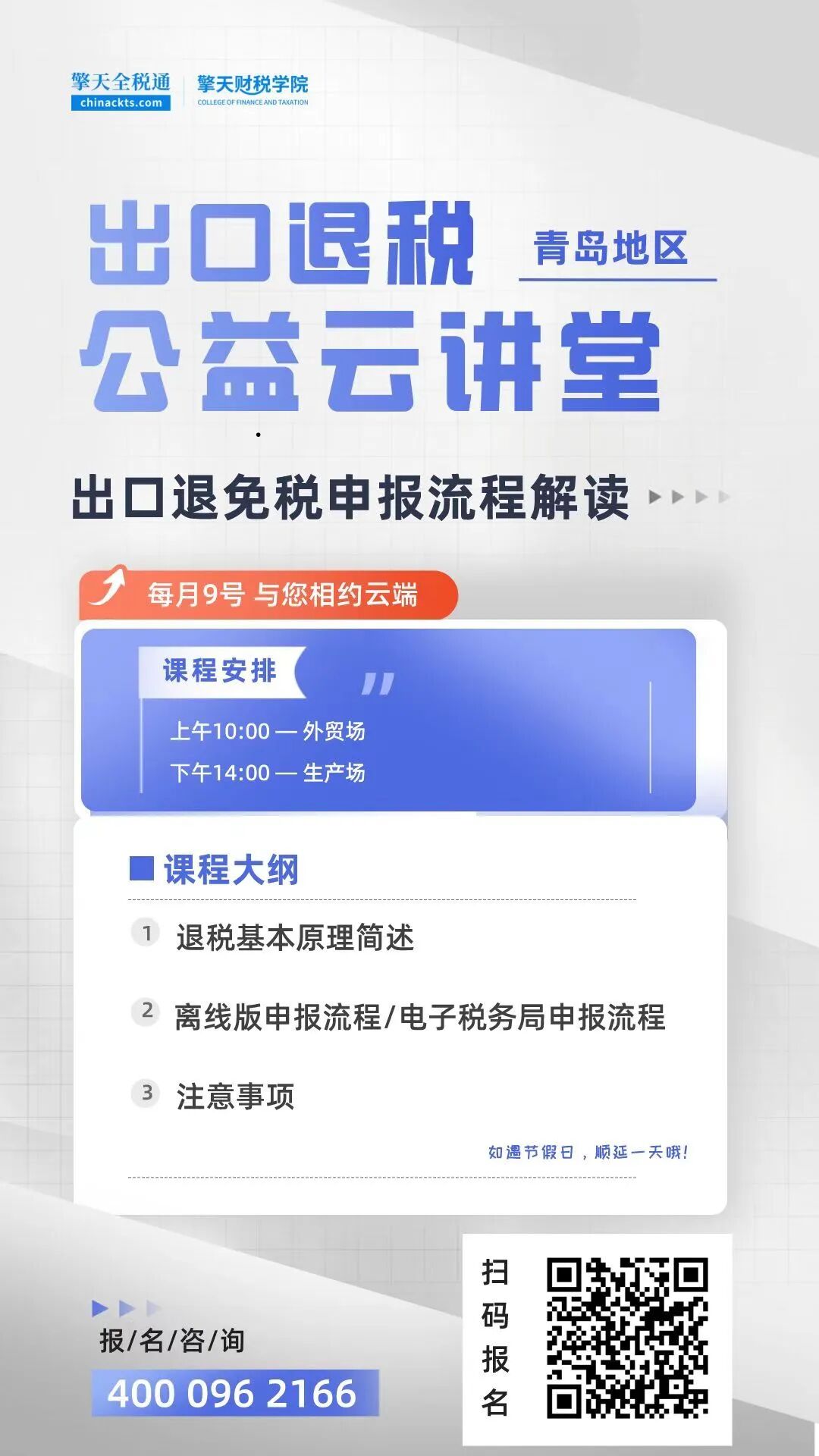 为协助青岛地区出口企业顺利完成出口退税申报,擎天自九月起推出9号公益日,每个月9号定期开展线上公益直播,如有需要请扫码关注,或转给有需要的小伙伴。