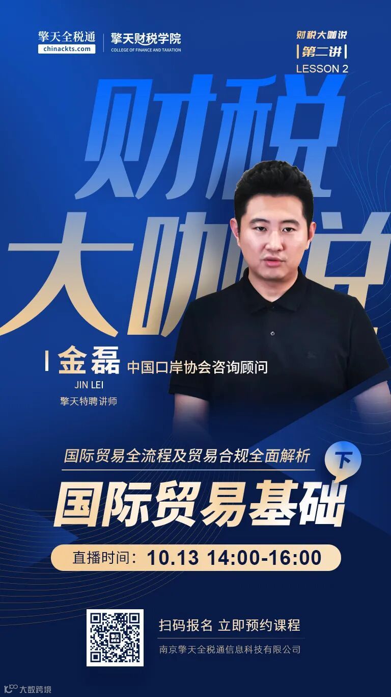 为助力出口企业打通对外贸易渠道,提高企业对海外市场趋势的认识,加深企业对外贸扶持政策的切身利益了解。10月13日,擎天全税通特别邀请到中国口岸协会咨询顾问金磊老师为大家进行第二期“国际贸易基础”系列课程免费直播。帮助企业对贸易流程及合规性作全面解析。