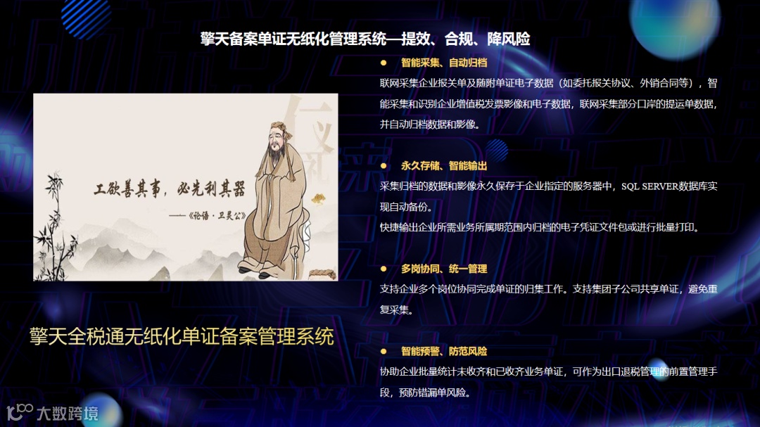 在此基础上,为了解决出口企业单证备案的操作繁杂、单证数量繁多、参与岗位众多、容易整理不全等问题,经过广泛调研税务机关和出口企业业务需求、大量企业测试与实际应用、多次迭代升级功能,擎天全税通无纸化单证备案管理系统具备智能采集、自动归档;永久存储、便捷输出;多岗协同、统一管理;智能预警、防范风险等若干技术优势,切实快速实现出口企业单证备案的数字化转型,充分展示擎天全税通在赋能出口企业单证备案财税合规方面帮助企业数字化转型的突出优势,真正起到了赋能出口企业快速构建单证备案数字化模型、帮助出口企业规避单证备案管理风险。