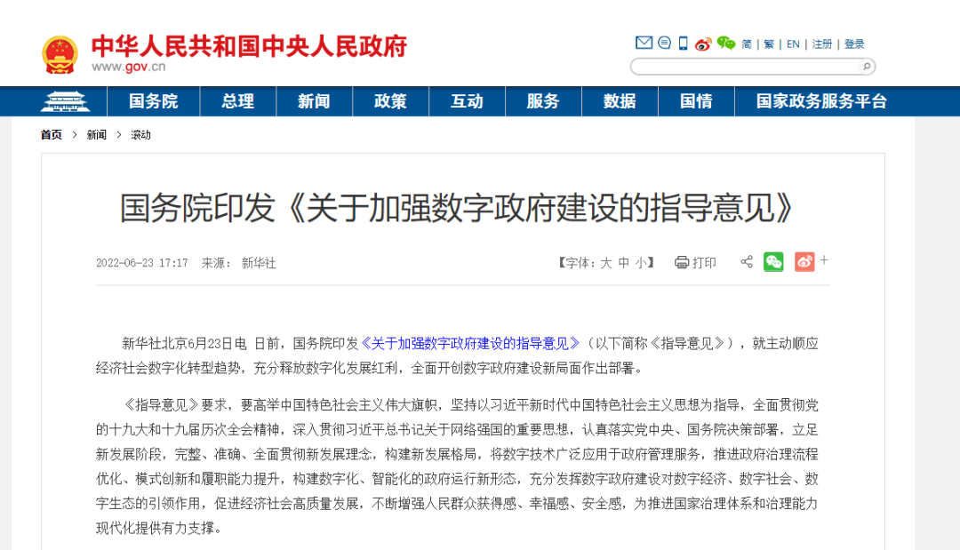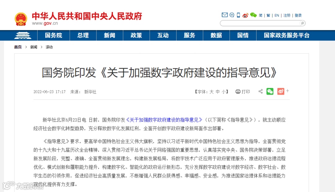 6月23日,国务院发布关于加强数字政府建设的指导意见:要求推进数字化共性应用集约建设。